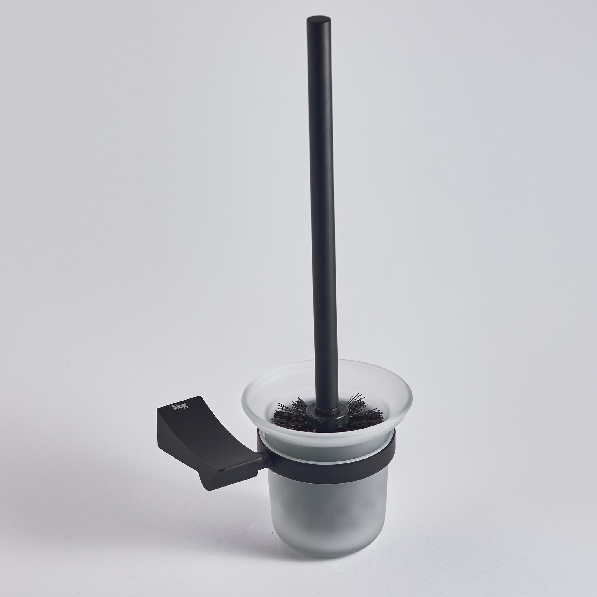 A sleek and modern solution for bathroom hygiene, this wall-mounted toilet brush holder features a matte black zinc alloy bracket and frosted glass cup. Stylish and durable, it keeps your brush accessible yet discreetly stored.